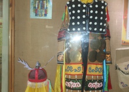 萨满服称为神衣是用鹿皮缝制而成的,长约四尺左右,过膝领口、袖口及前襟等部分都有各色云字花纹,并缀有各色贝壳纽扣等。腰上系有较宽的皮带,在腰带下而缝有各色宽飘带,一直要到脚面,前胸后背挂满了许多大大小小的铜镜盘。整个神衣闪闪发光,稍一碰动就会发出声响。